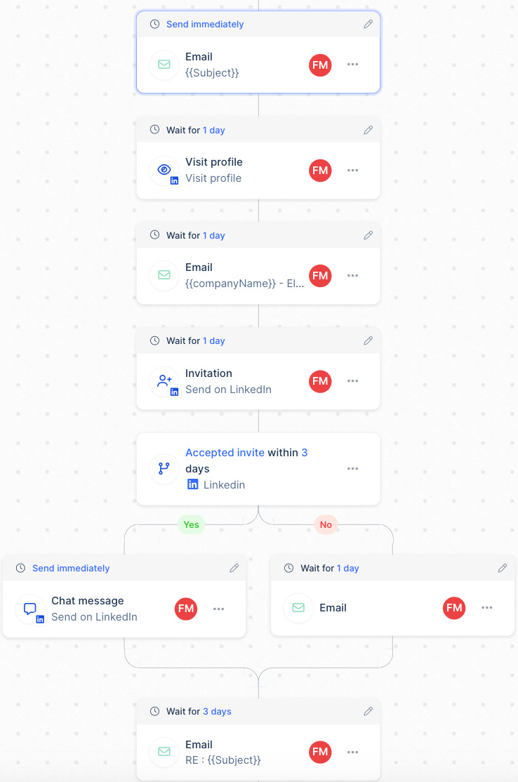 Ici, on a des bris de glace différents pour chaque prise de contact. Ces variables sont ajoutées dans la séquence de prospection (linkedin + mail). On personnalise uniquement quelques variables en gardant le template.
