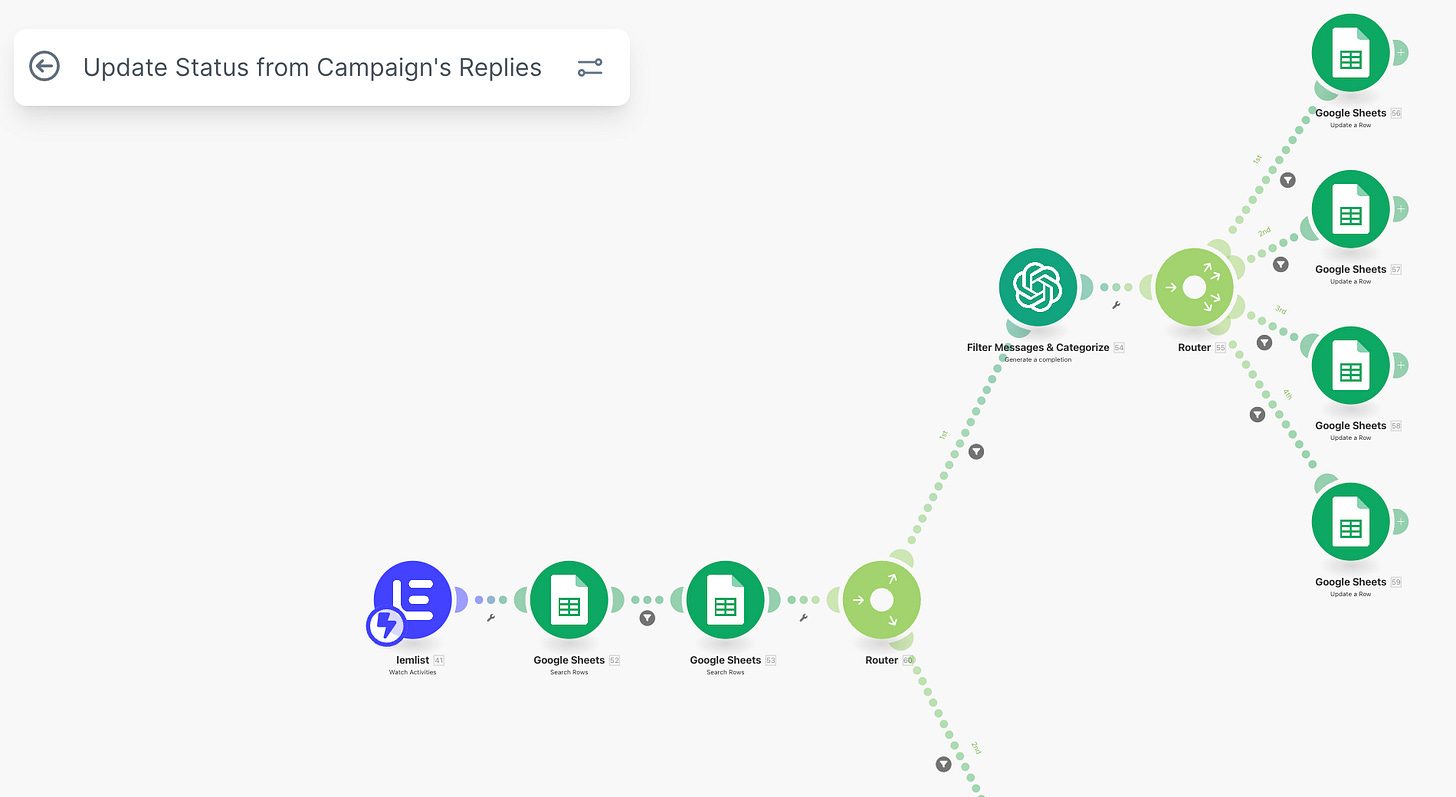 Ici, dès qu’on a une réponse d’une campagne sur lemlist, on analyse la réponse pour mettre à jour le statut automatiquement avec une simple automatisation make.