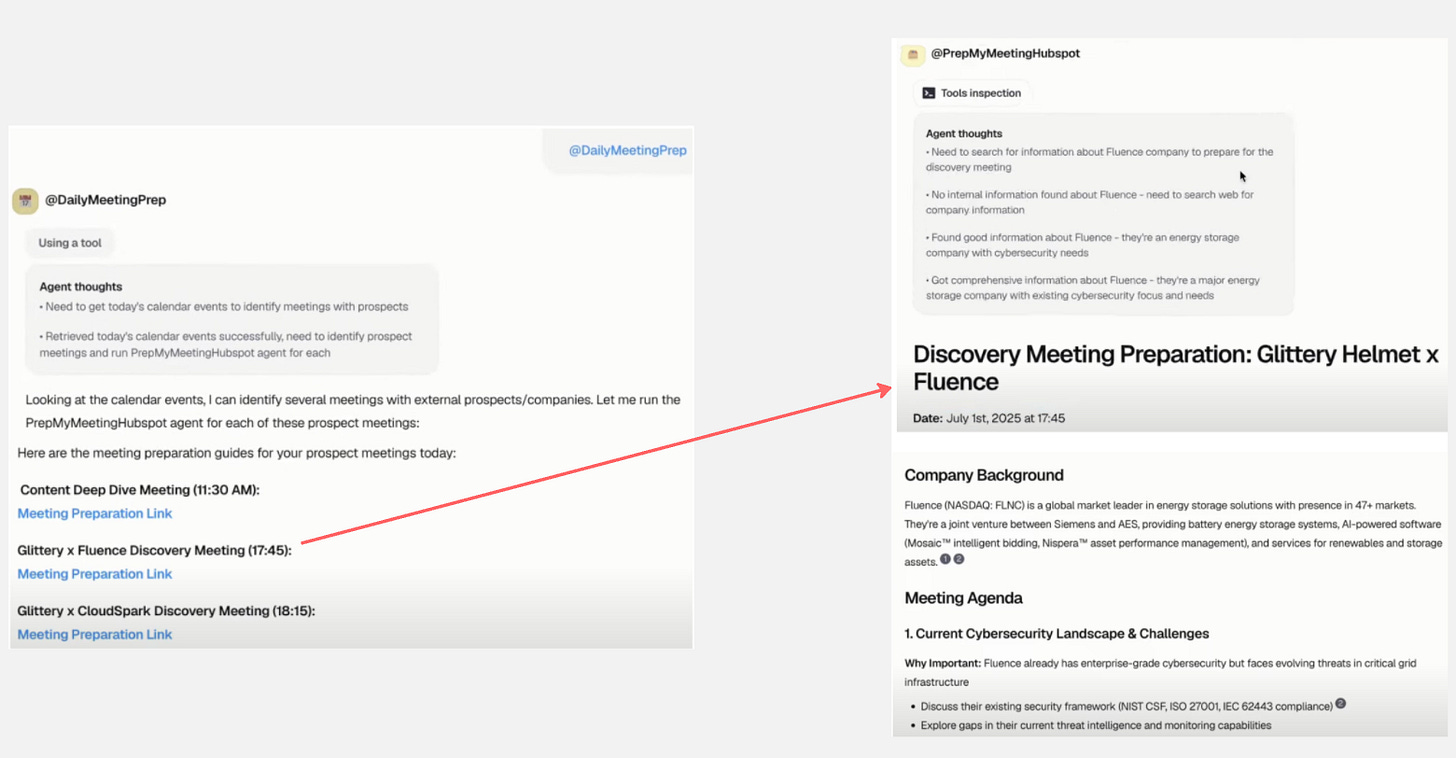 Ici par exemple, l’assistant “DailyMeetingPrep” est déclenché chaque matin de jour ouvré pour lister les RDV et préparer ceux qui sont des RDV commerciaux. Pour ça, il appelle un autre assistant “PrepMeetingHubspot” qui va récupérer des informations internes (CRM, hubspot ici + docs internes) et externe (web, réseaux sociaux) pour générer un rapport complet.