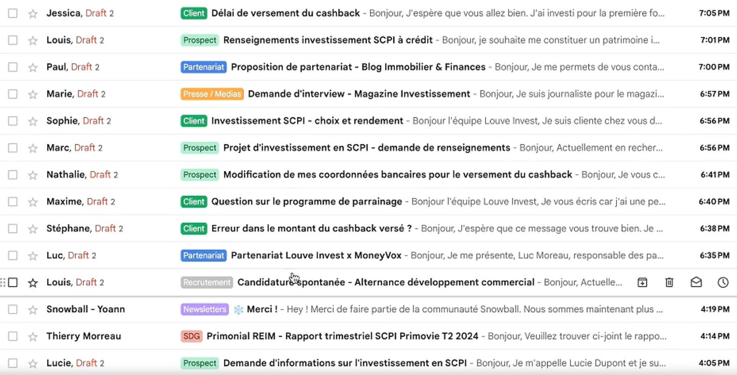 Ici un aperçu de mails catégorisés + génération de brouillon pour chaque mail demandant une réponse :