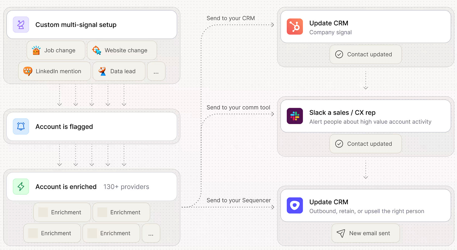 Concrètement, sur l’ensemble des opportunités dans le pipe, une recherche hebdo est lancée pour récupérer les dernières actualités de l’entreprise, les analyser et sélectionner celle qui est pertinente pour relancer le prospect sur son besoin “J’ai vu que vous veniez de lancer une campagne marketing dans le métro parisien ! Bravo, j’espère que …”.