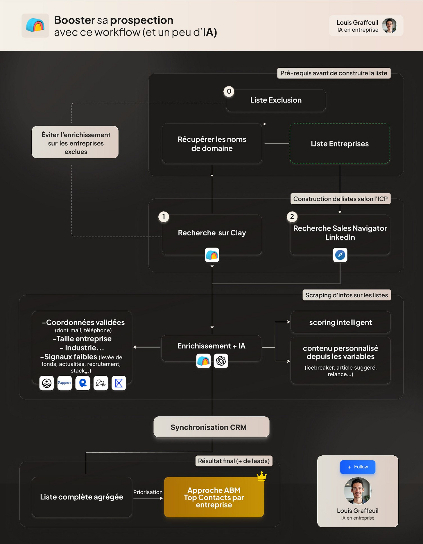 J’ai partagé sur LinkedIn ce workflow qui décrit les étapes de la génération de leads jusqu’à l’enrichissement et synchronisation CRM.